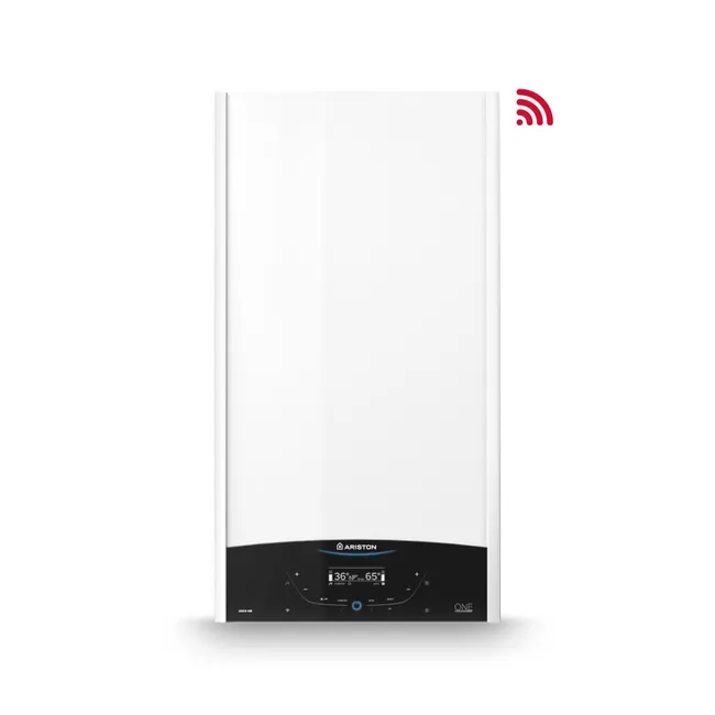 Caldera de condensación de gas natural mural Ariston Genus One+ de 30 kW de potencia, ideal para viviendas grandes con hasta 2 baños. Alta eficiencia energética (A+), modulante, pantalla táctil a color, conectividad inteligente por app Ariston NET. Muy silenciosa, con funcionamiento estable y preciso. Cámara estanca, control digital, instalación mural. Dimensiones: 400 x 745 x 385 mm. Incluye kit de evacuación de gases.